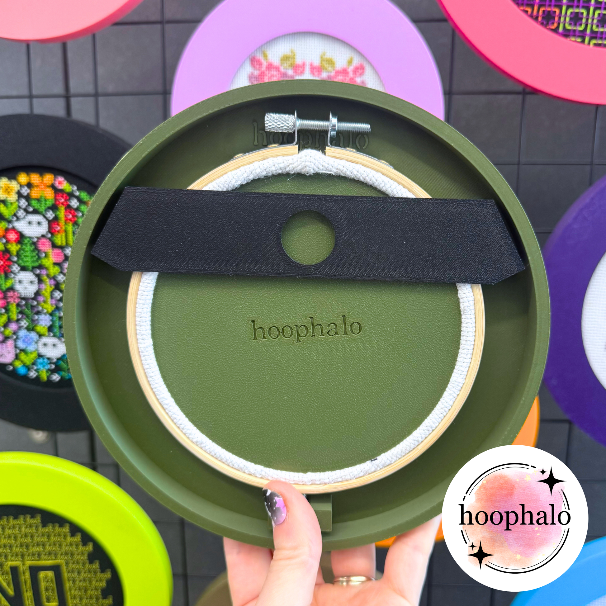 These custom designed hangers slip over the top two frame holding points after you have secured your hoop into your hoophalo frame, and give you an easy way to hanger the frame on the wall!